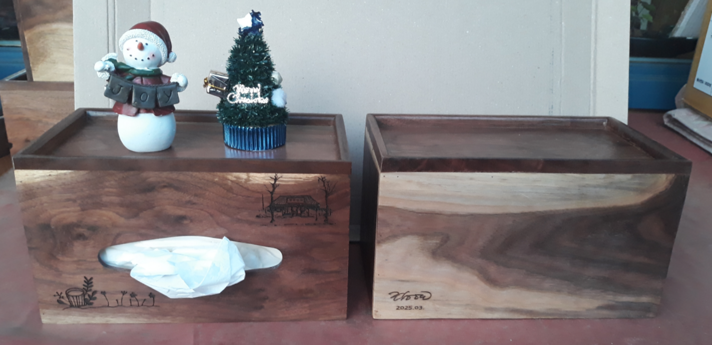 2년전 마님께서 곽휴지통을 움직이다가위에서 뻬쓰는 기존의 휴지곽통을휴지를 옆에서 뻬쓰고 위에는 소품을 올려 놓게 해달라는 아이디어에 만든 휴지곽통 청주에서 공방을 하시는 사장님두께 약 25mm ,폭 150~350mm, 길이 2m 정도의 월넛판재를 번들로 100여장 사셨는데야외에다 보관을 잘못하셔서 습기와 벌레로 못쓰겠다며가져다가 땔감으로 사용하라고 주셨는데너무 아까워 벌레 먹고 곰삭은 부분을 피해서 쓰고 있습니다.25mm의 판재를 켜서 두쪽으로 만들어 양면대패를 하면 약 8mm 두께 판재를 만들어지고 이 녀석들을 이용해서 아이디어 휴지곽통을 만듭니다. 여기에 레이저각인기를 이용하여 그림을 넣어 포인트를 주고... 제법 인기가 있다.30여개를 만들어 집에 방문하는 분들 혹은 지인들께 나누어 주었습니다.그..